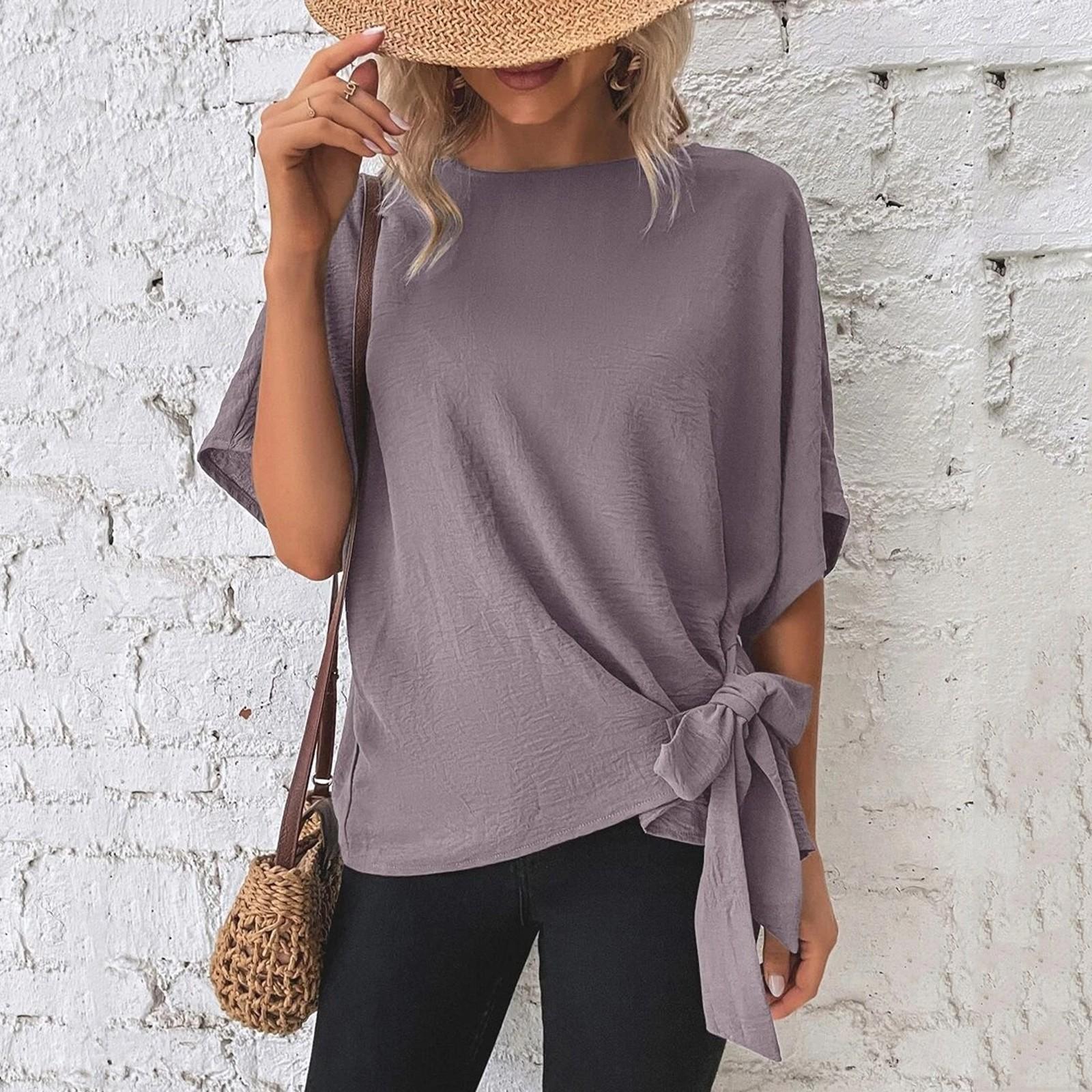 Женская однотонная футболка с круглым вырезом и коротким рукавом, свободный топ с узлом на подоле XL фиолетовый