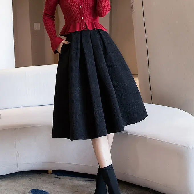 Женская осенне-зимняя юбка трапециевидной формы с высокой талией и карманами