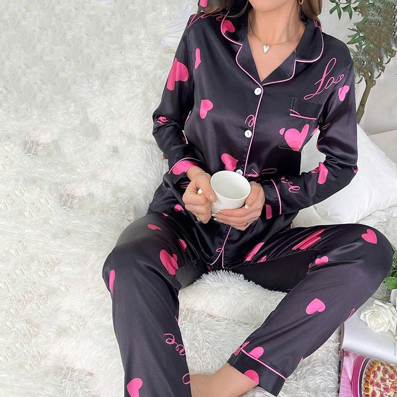 Женская осенняя атласная пижама с принтом, комплект из 2 предметов, топ с длинными рукавами, длинные брюки, повседневный и удобный домашний комплект, повседневный комплект из двух предметов XL чёрный