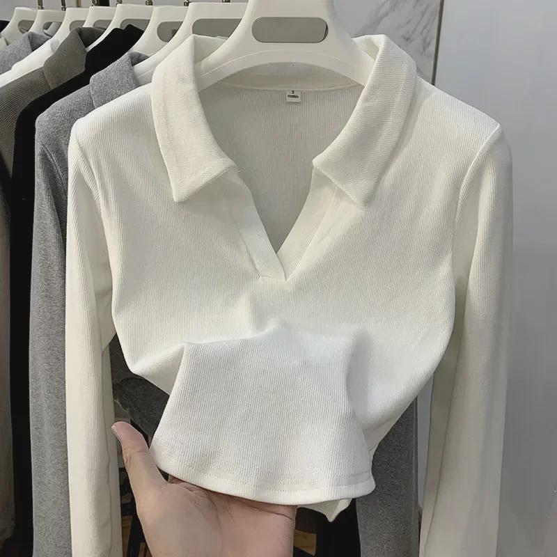 Женская осенняя футболка с воротником-поло и длинными рукавами белого цвета - шикарный стиль L белый