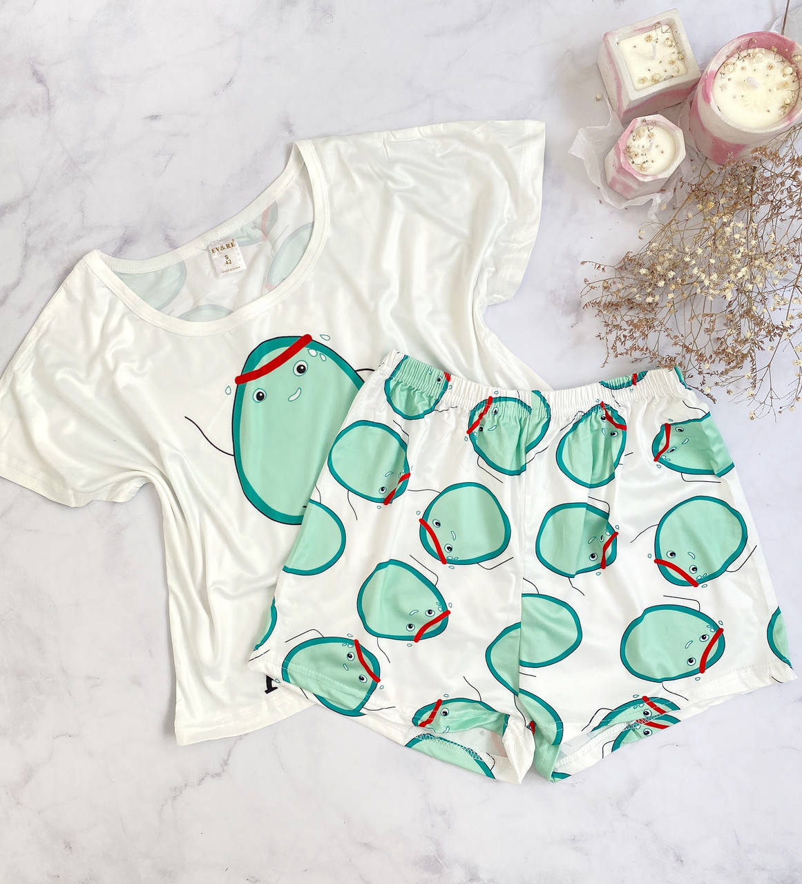 Женские легкая пижама с рисунком. Футболка укороченная, свободного кроя.