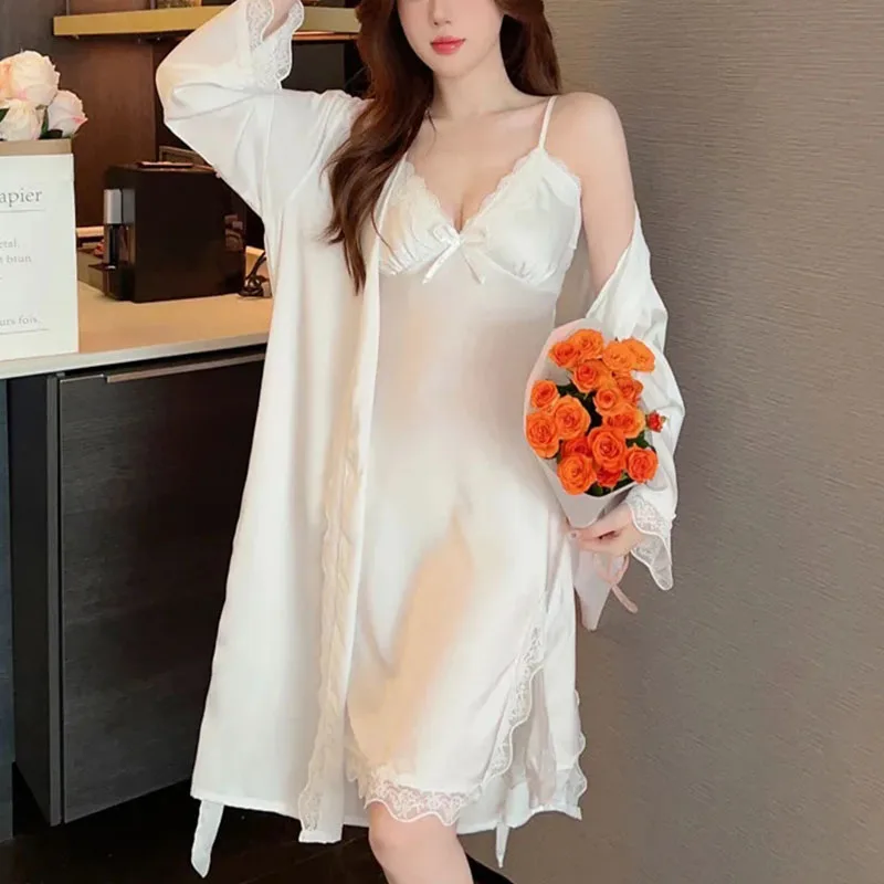 Женская пикантная ночная рубашка, шелковый халат + ночная рубашка без рукавов, комплект из 2 предметов, лето 2023, домашняя одежда с цветочным принтом, женская ночная рубашка