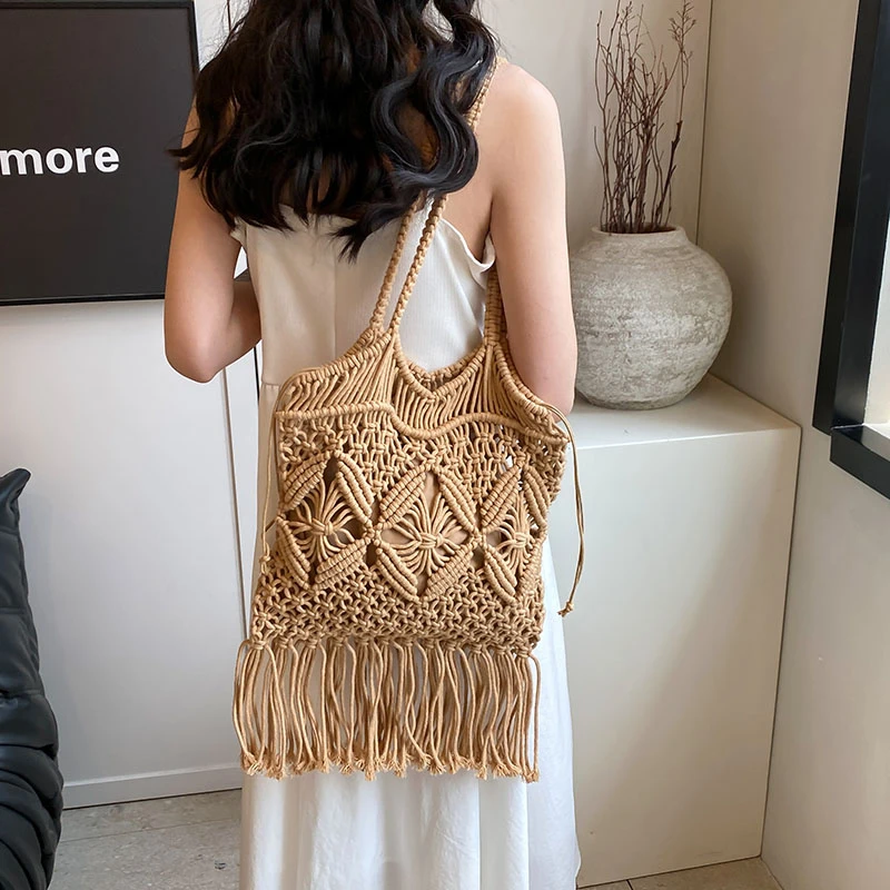 Женская плетеная сумка на плечо, однотонная вместительная сумка в богемном стиле, 2024