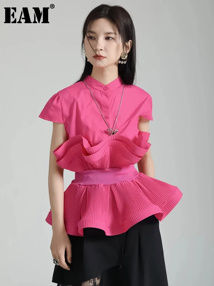 Женская плиссированная блузка [EAM], розово-красная элегантная Свободная блузка с воротником-стойкой и коротким рукавом, 1DF7819, весна-лето 2024