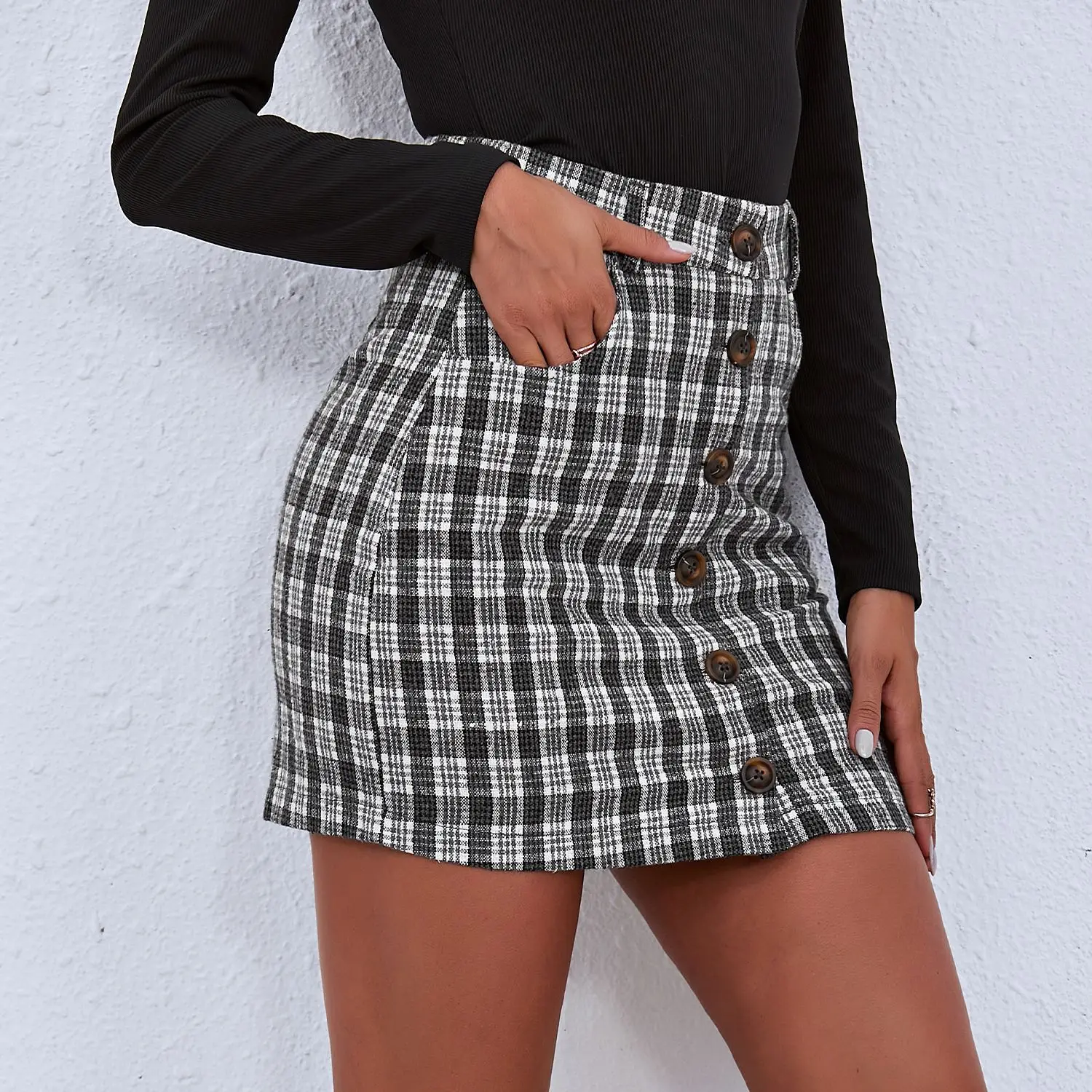 Женская плиссированная мини-юбка, короткая клетчатая юбка с высокой талией и пуговицами, весна-лето 2022