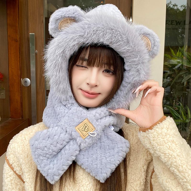 Женская плюшевая шапка в виде головы льва с шарфом — милая и теплая на осень/зиму One size серый