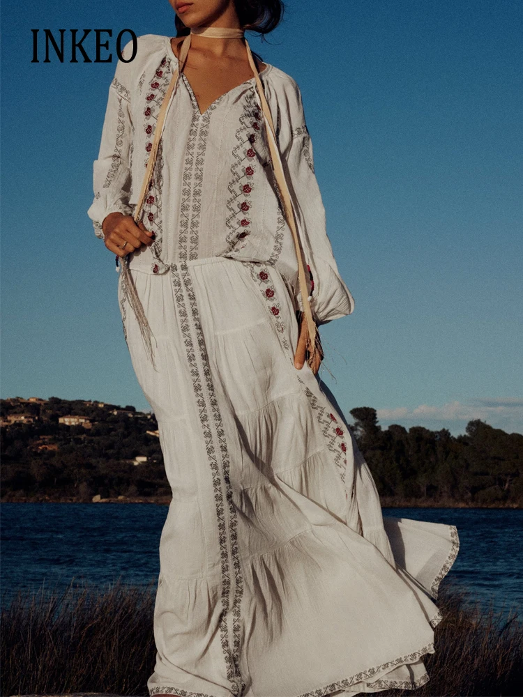 Женская пляжная блузка с цветочной вышивкой, длинная юбка с поясом на резинке, женская рубашка с длинным рукавом, Женский комплект из 2 предметов, уличная одежда INKEO 3T097