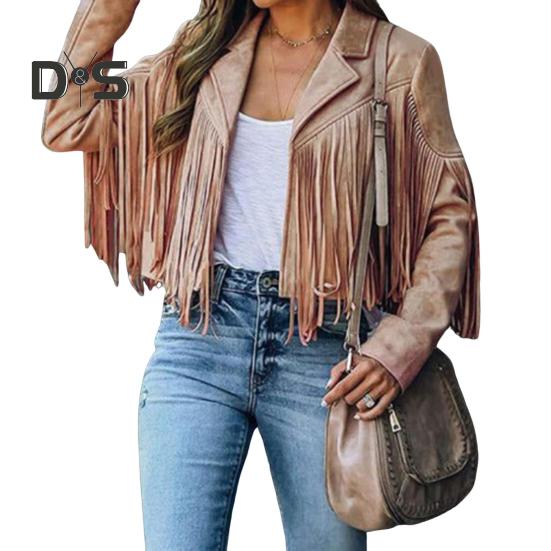 Женская повседневная куртка с кисточками, длинными рукавами, лацканами, укороченное пальто из искусственной замши, байкерская верхняя одежда на весну и осень S коричневый
