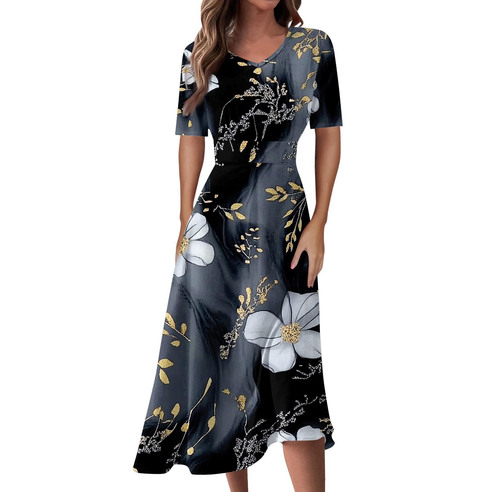 Женская повседневная мода Цветочный (лист) Платье-халат с принтом, V-образным вырезом, короткими рукавами и длинной юбкой-халат L чёрный