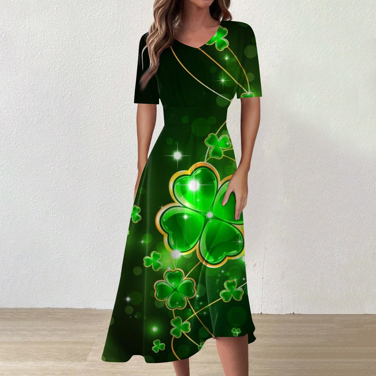 Женская повседневная мода St. Длинное свободное платье с принтом ко Дню Святого Патрика, V-образным вырезом, короткими рукавами и талией M