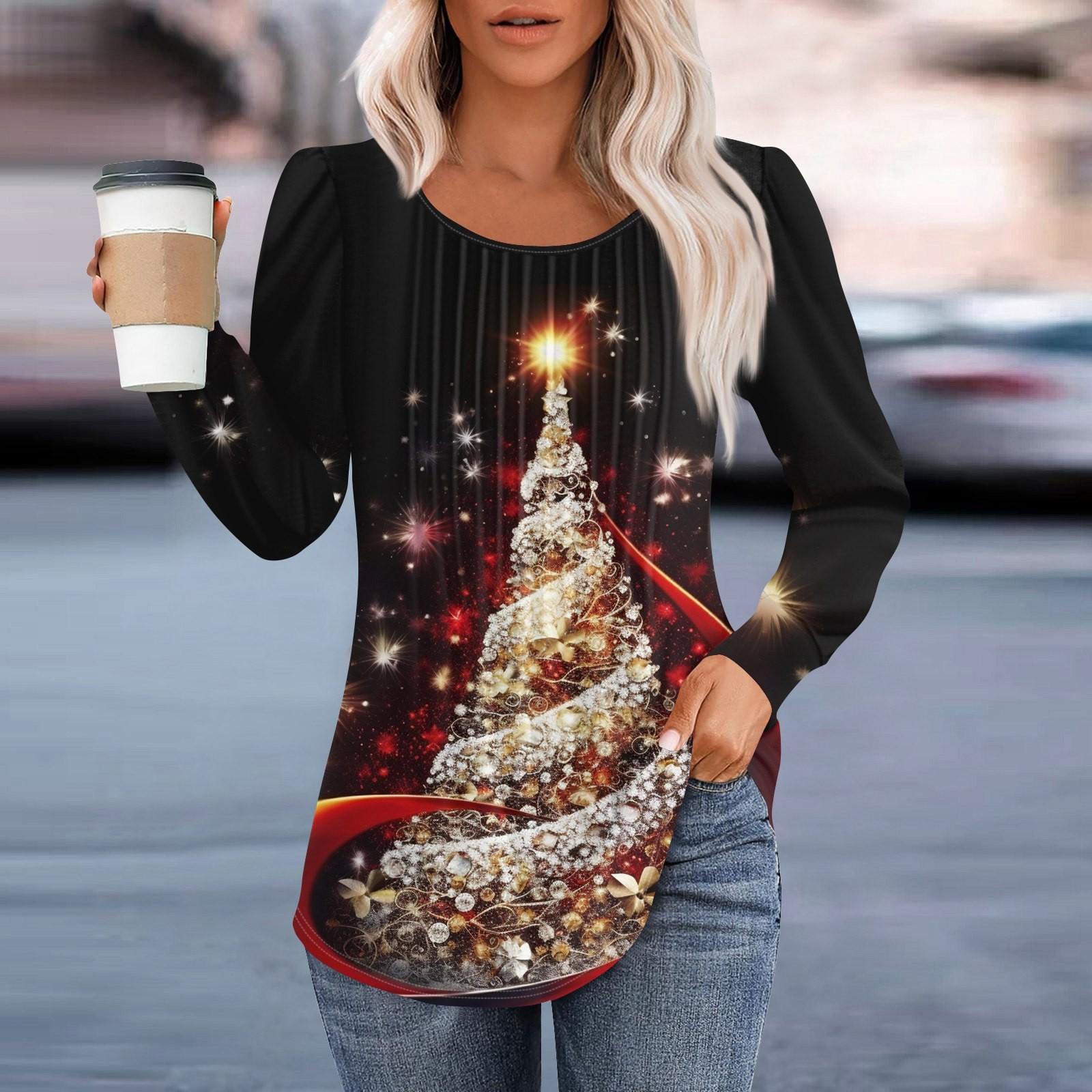Женская повседневная и модная принтованная футболка с круглым вырезом и длинными рукавами, плиссированная футболка на Рождество XXXL коричневый