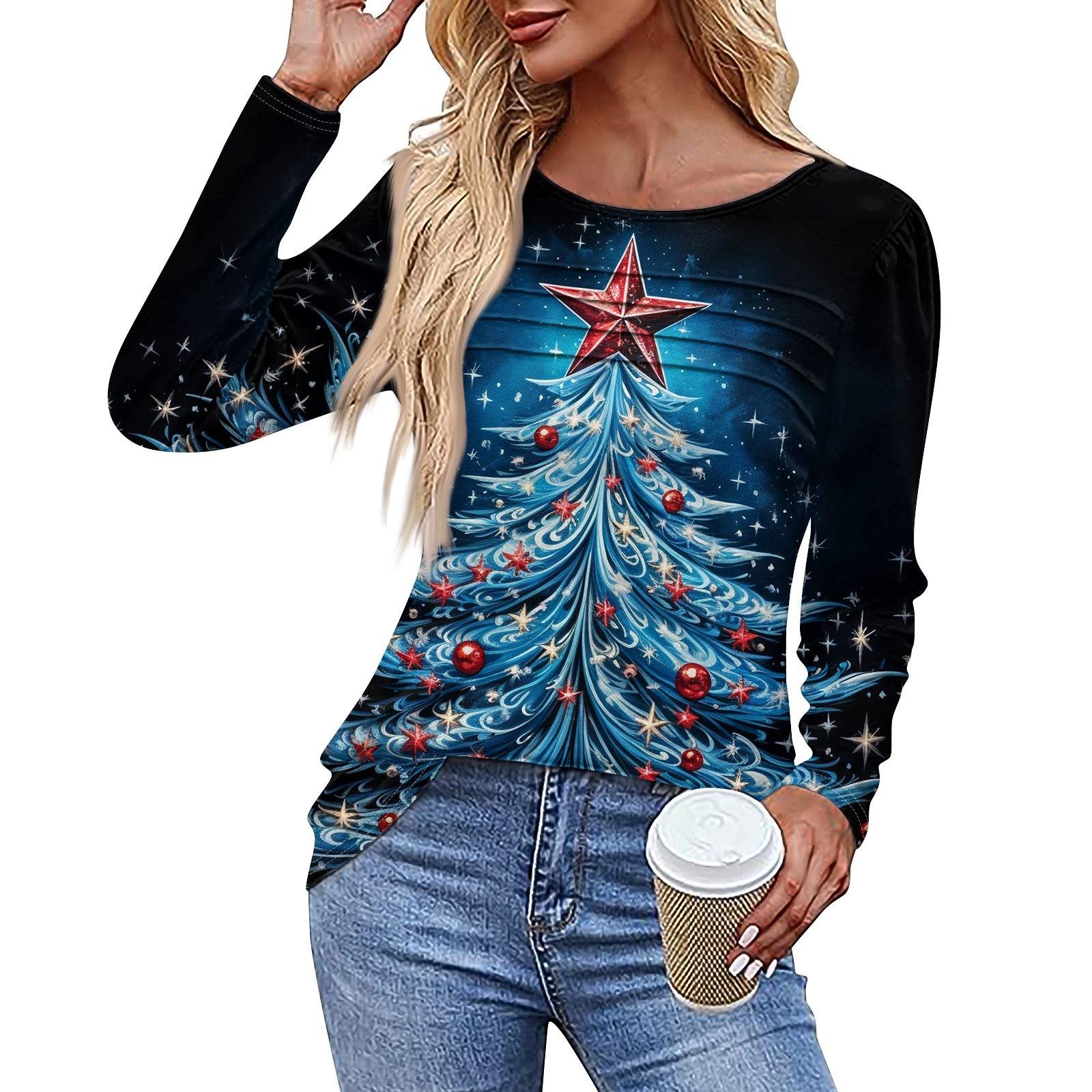 Женская повседневная модная футболка с круглым вырезом и длинными складками на Рождество S тёмно-синий