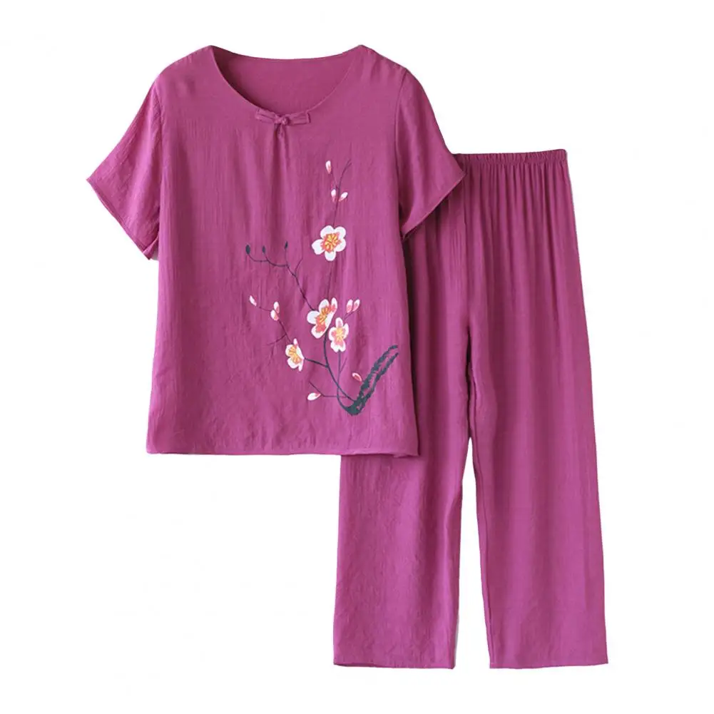 Женская повседневная одежда, Женский пижамный комплект, элегантный Пижамный комплект для женщин среднего возраста с цветочным принтом, топ с коротким рукавом и широкими штанинами для мам
