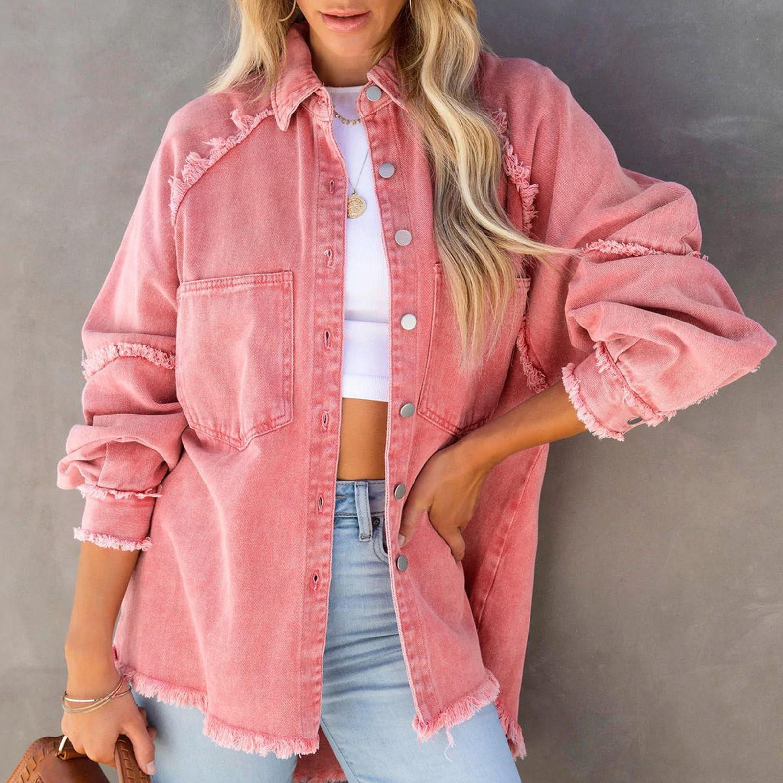 Женская повседневная потертая джинсовая куртка с кисточками и отверстиями, свободная однотонная джинсовая куртка XL розовый