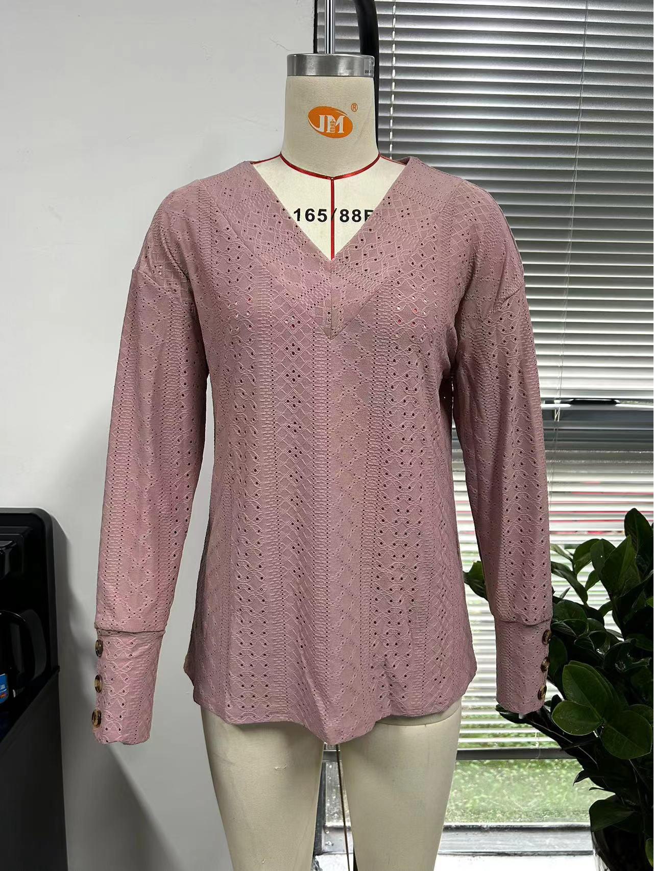 2024 Женская повседневная рубашка с V-образным вырезом и длинным рукавом, кружевной вышивкой на пуговицах M