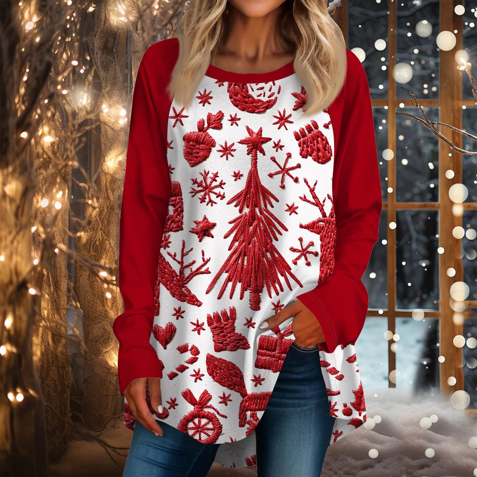Женская повседневная футболка больших размеров с длинными рукавами и круглым вырезом с рождественским принтом, топ, пуловер M красный