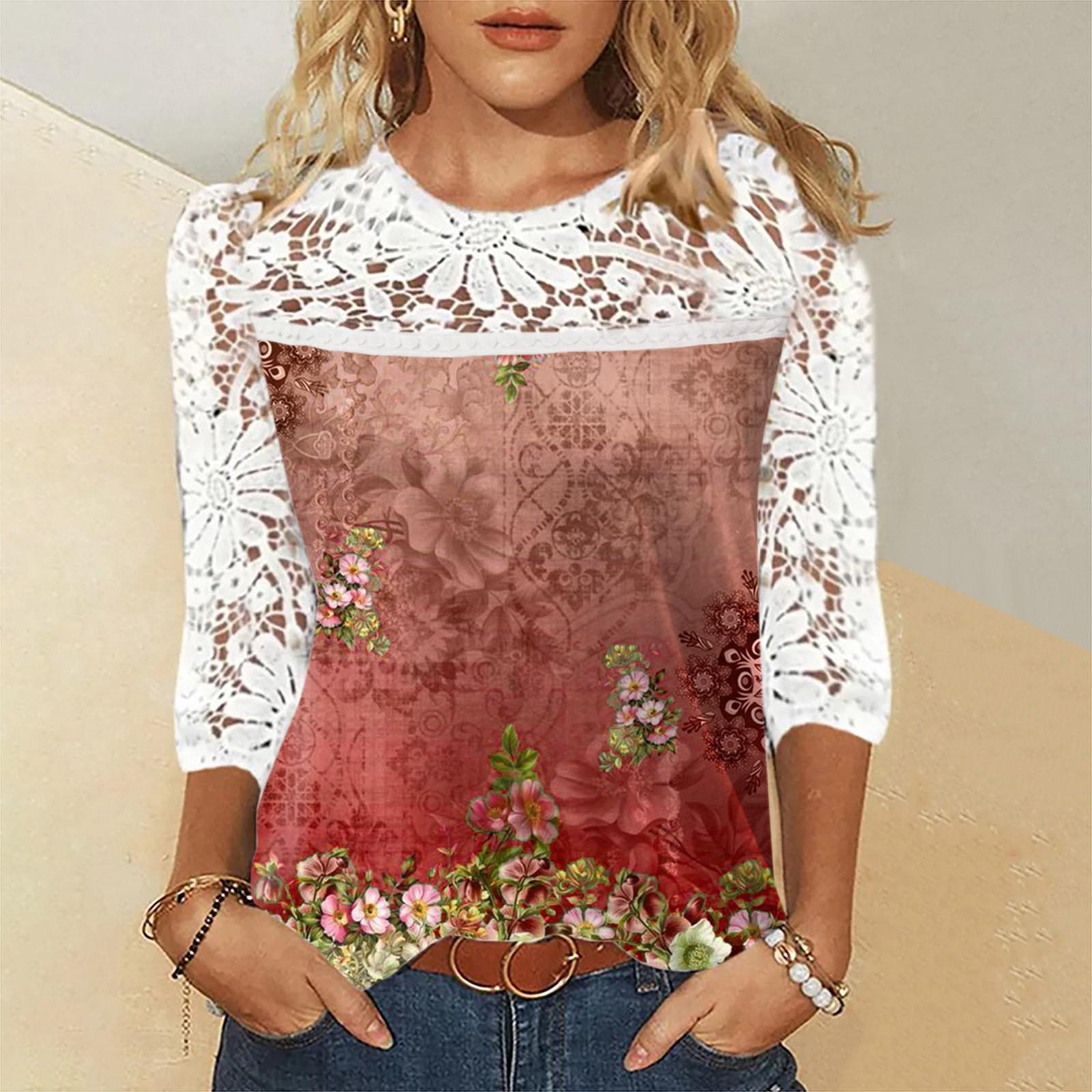 Женская повседневная футболка с круглым вырезом и кружевным вырезом с семиточечным рукавом и принтом S красный