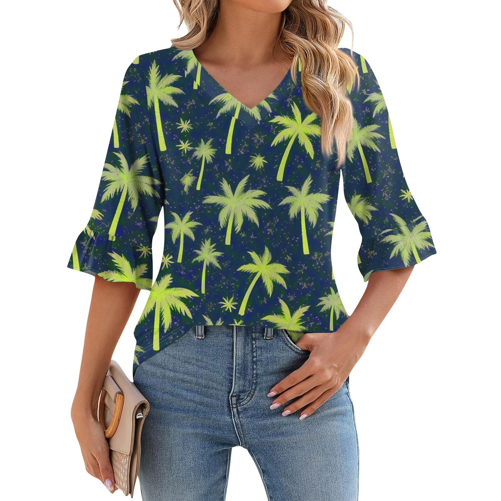Женская повседневная футболка с рукавом 3/4, летняя футболка с V-образным вырезом и пышными рукавами, гавайский принт XXL