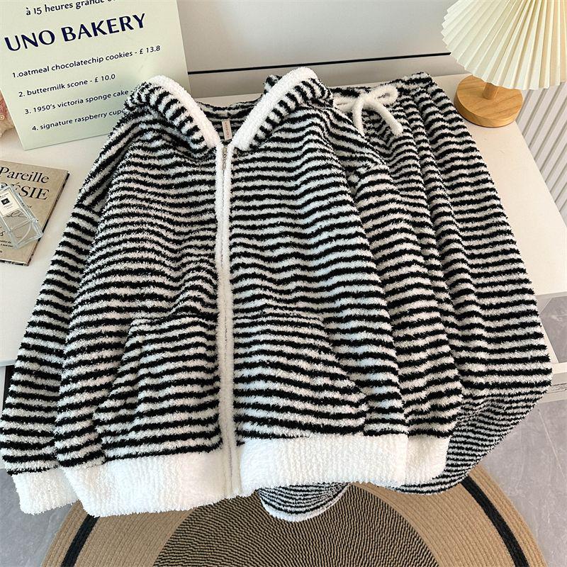 Женская полосатая пижама из кораллового флиса: Уютная, теплая домашняя одежда на молнии для осени/зимы XL