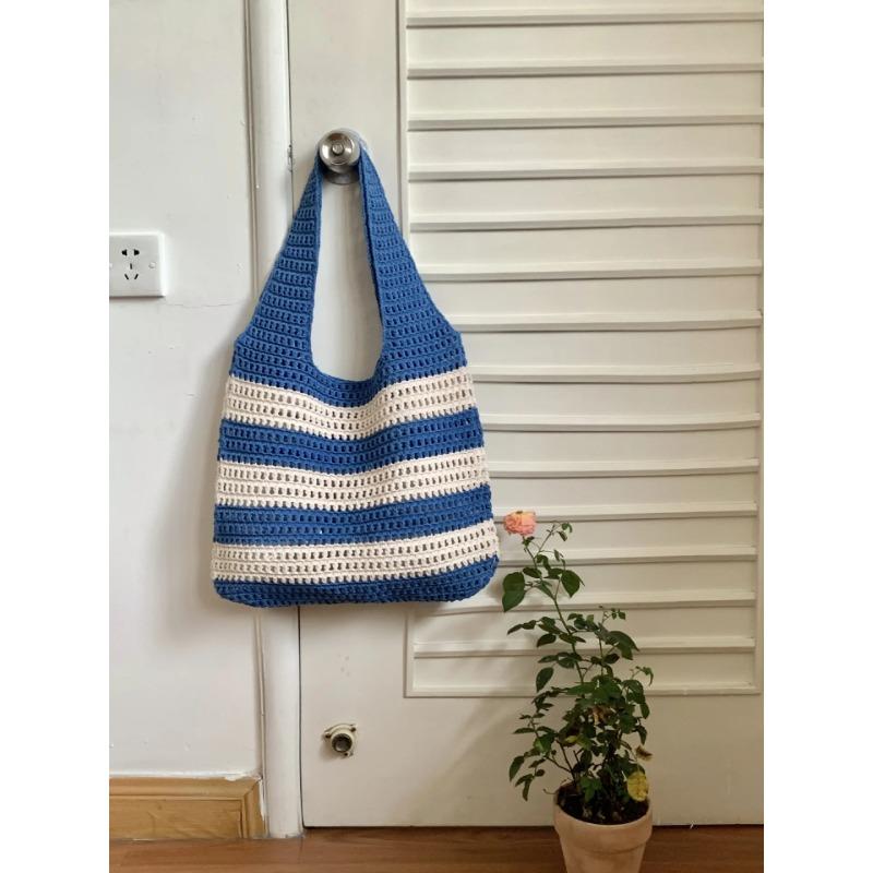 Женская полосатая тканая сумка через плечо контрастного цвета вязаная сумка-тоут полая трикотажная полосатая сумка-шоппер для женщин небесно-голубой