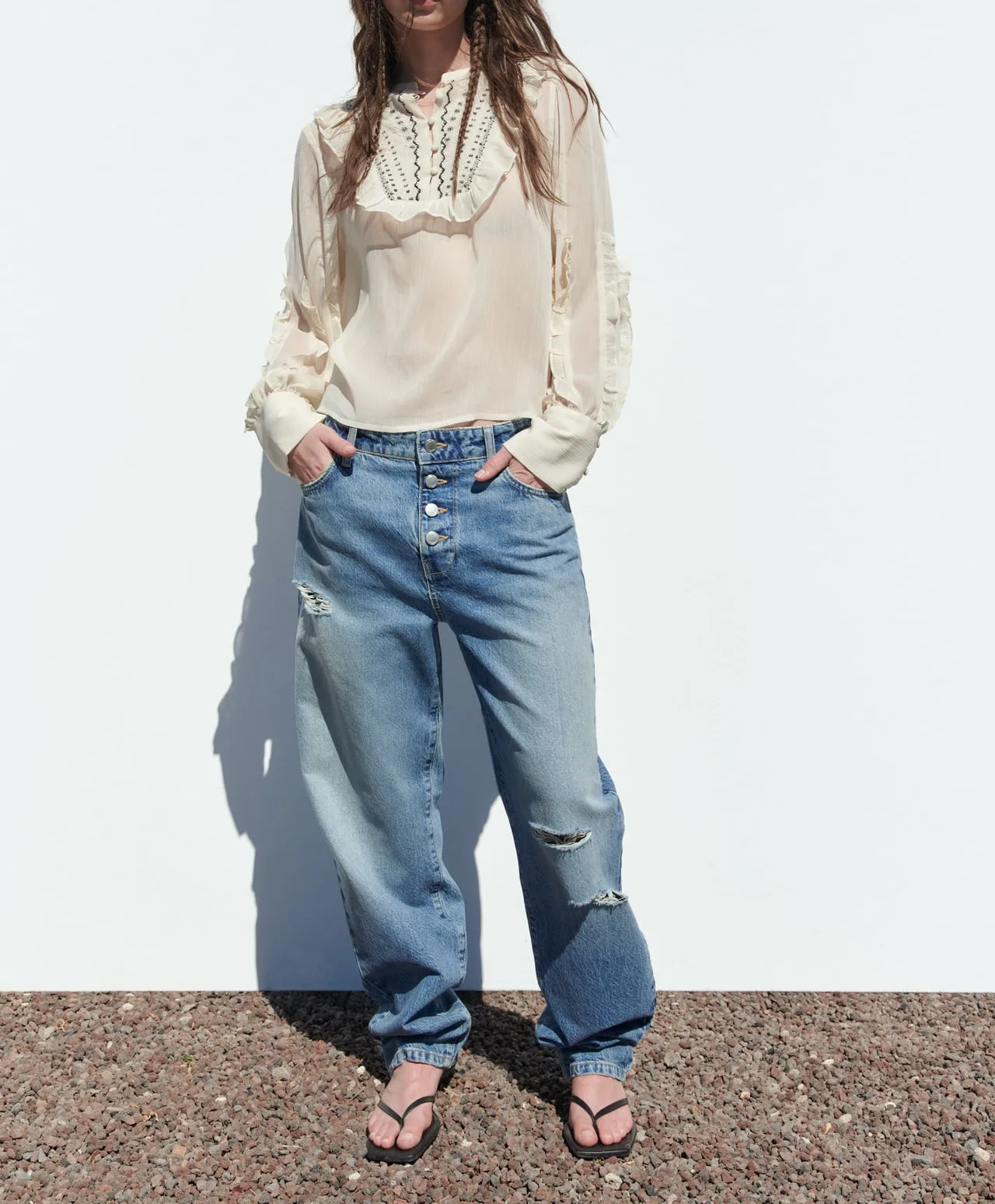 Женская прозрачная рубашка с круглым вырезом, длинным рукавом и бусинами