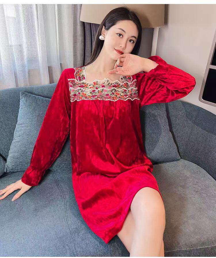 Женская роскошная ночная сорочка из красного бархата - Элегантная осенне-зимняя домашняя одежда 4XL (160-180 Jin)