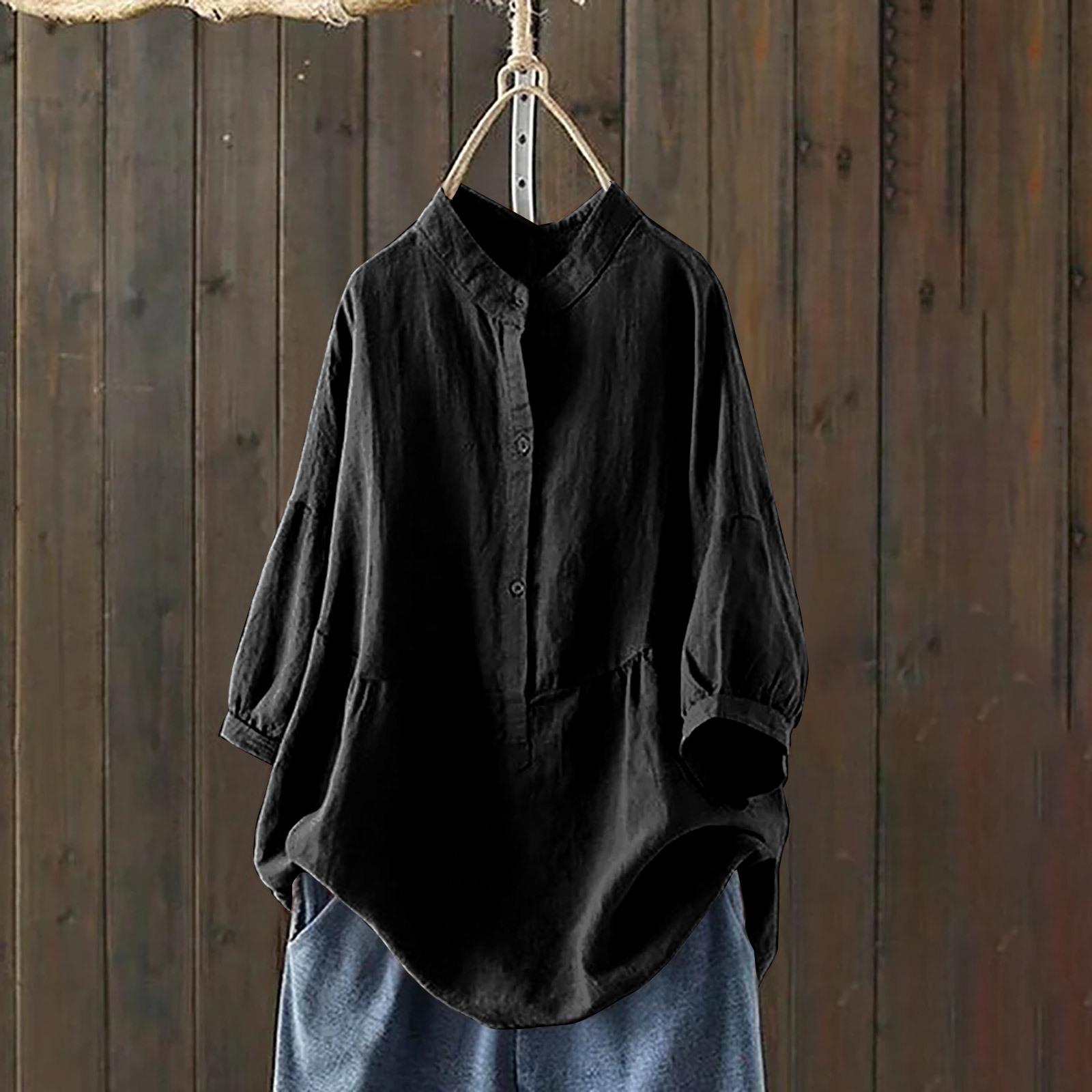 Женская рубашка весна-лето, воротник-стойка, однобортный, в национальном стиле, однотонный, с длинными рукавами, большой размер XL чёрный
