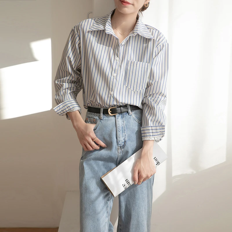 Женская рубашка в полоску, Офисная однобортная Свободная рубашка в Корейском стиле с длинным рукавом и синими полосками, весна 2024