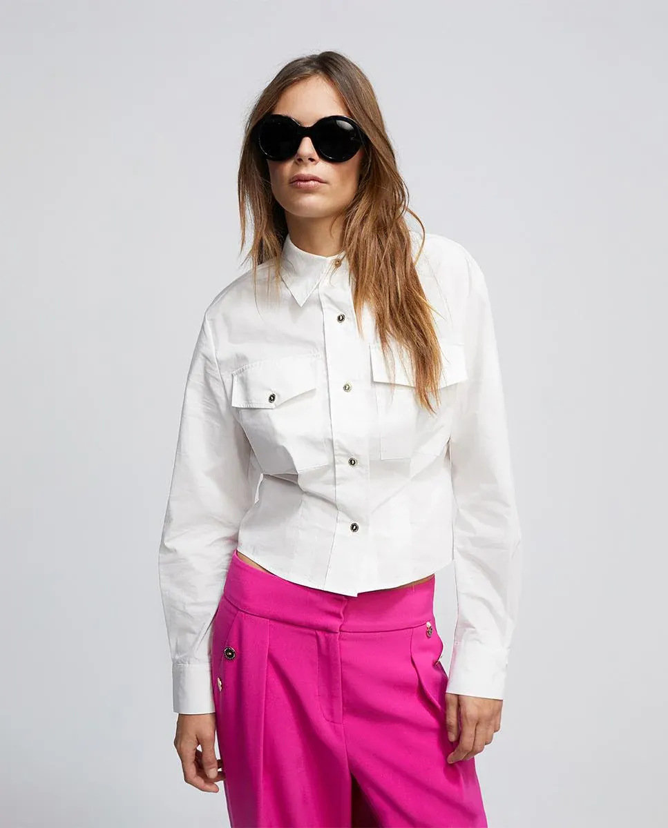 Укороченная рубашка. Воротник и манжеты рубашки. Накладные карманы с клапаном. Застежка на золотые пуговицы.
