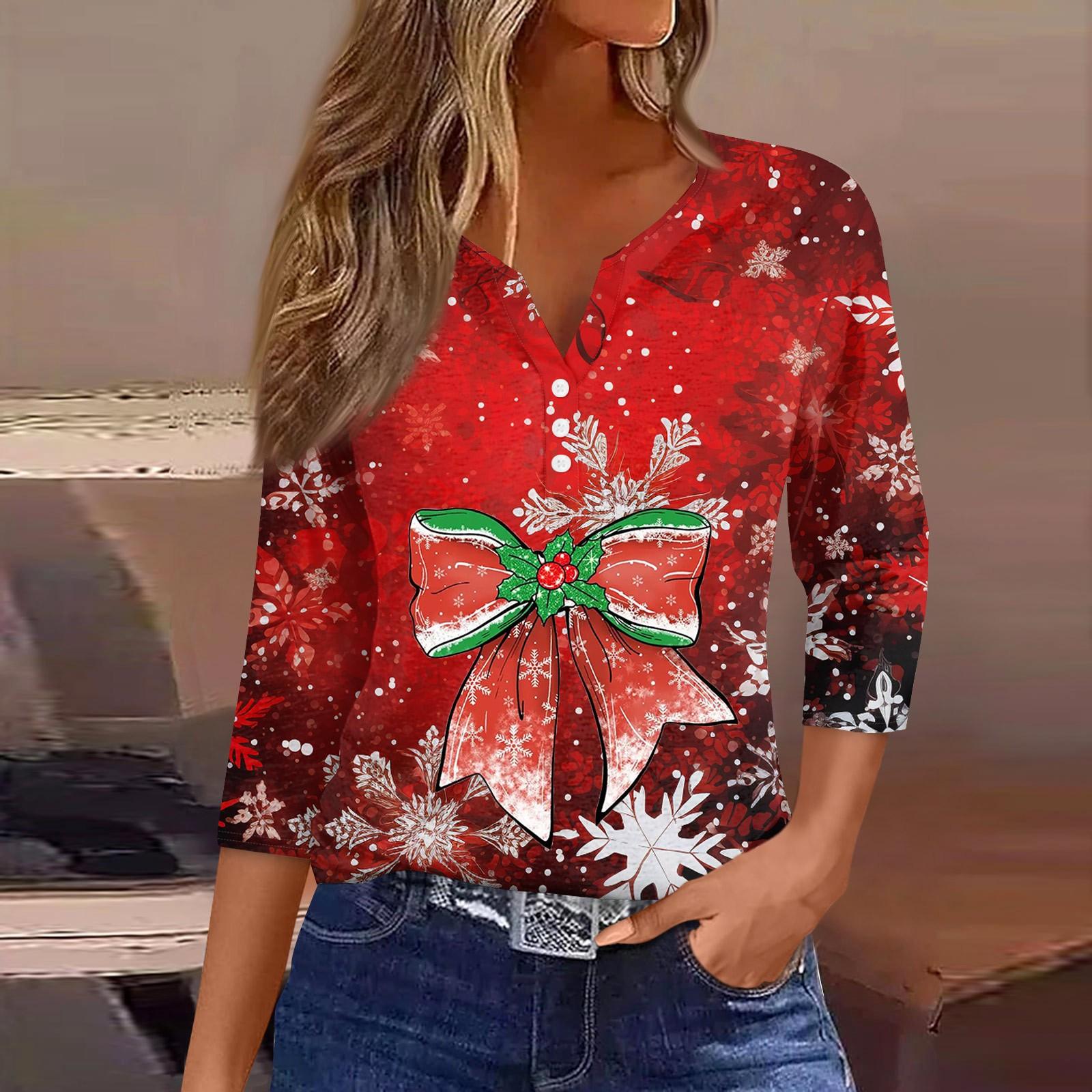 Женская рубашка с рукавом семь дюймов, напечатанная в стиле ретро, повседневная, свободная, с V-образным вырезом, рождественская XL красный