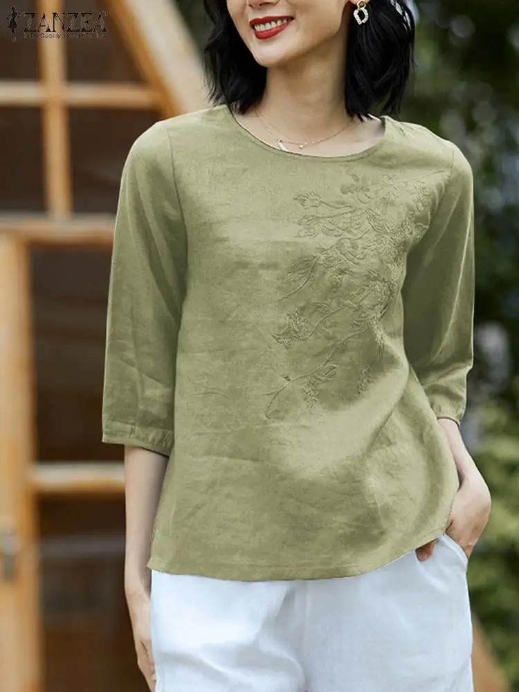 Женская рубашка с цветочной вышивкой ZANZEA 2023, осенняя туника с круглым вырезом и рукавом 3/4, повседневная женская элегантная блузка