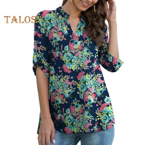 Женская рубашка с V-образным вырезом, рукавами 3/4, легкие топы с цветочным принтом, струящийся подол, туника, топы на каждый день M I