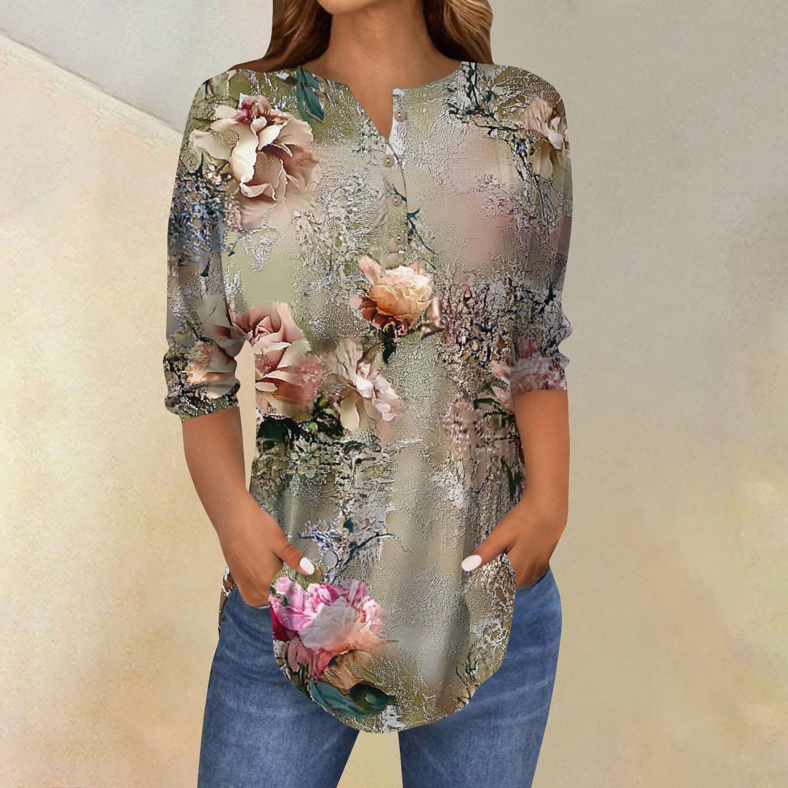 Женская свободная футболка с воротником на пуговицах и винтажным цветочным принтом, рукав три четверти XL небесно-голубой