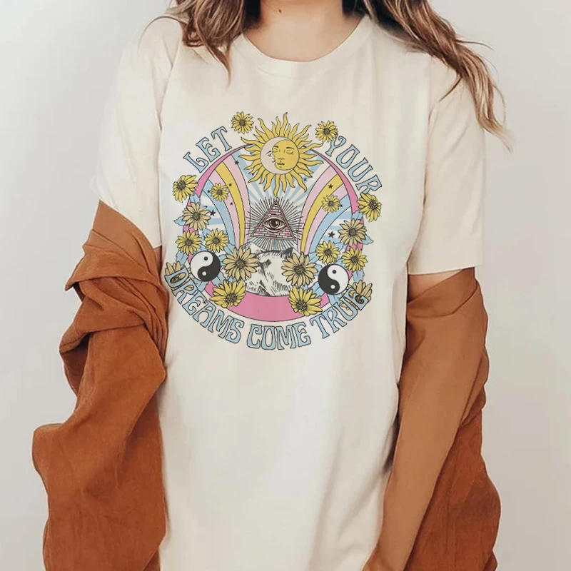 Женская свободная футболка с цветочным принтом, Винтажная футболка в стиле «хиппи»