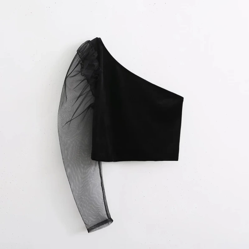 Женская сетчатая короткая блузка с пышными рукавами и одним плечом