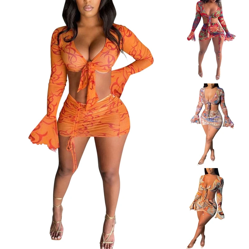 Женская сетчатая мини-юбка с тропическим принтом, длинным рукавом и рюшами