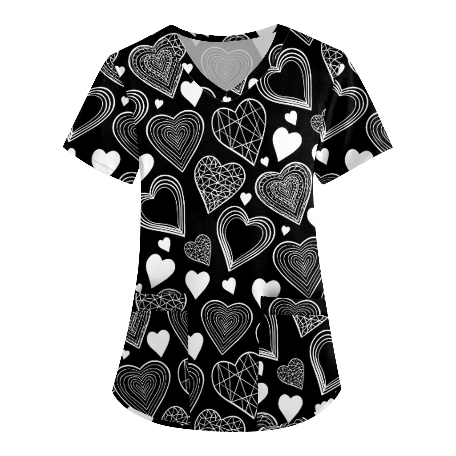 Женская симпатичная принтованная рабочая одежда с V-образным вырезом, двухслойными карманами, базовым коротким рукавом, пуловером ко Дню святого Валентина L чёрный