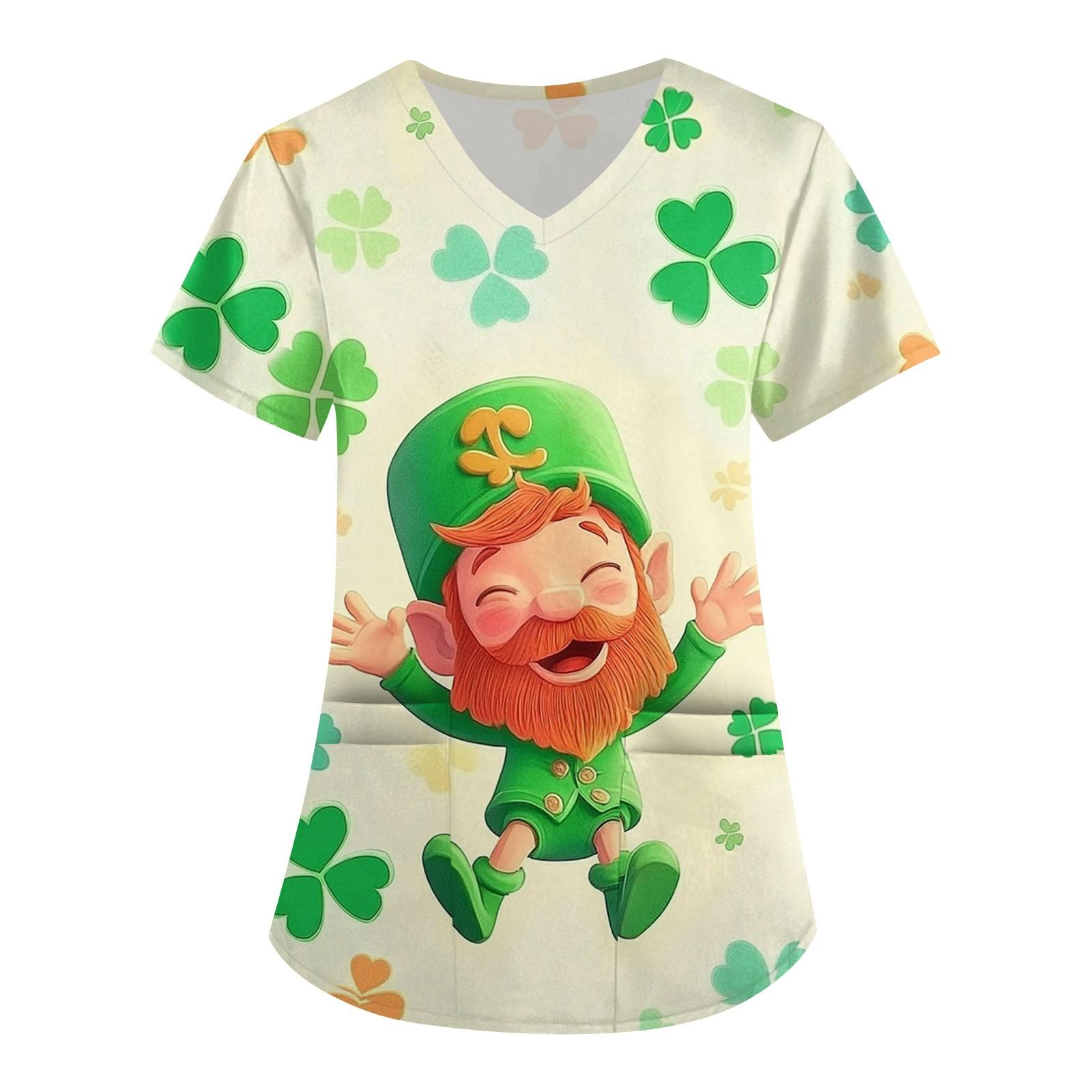 Женская симпатичная рабочая одежда с принтом, V-образным вырезом, двухслойными карманами, базовым коротким рукавом, пуловером St.. День Патрика XL белый