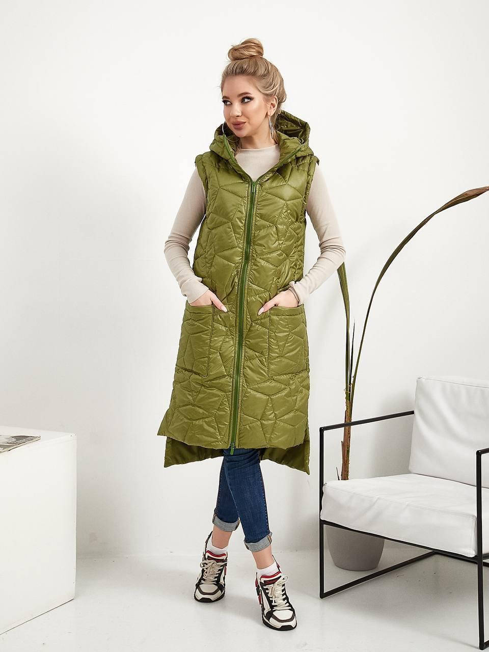 Прогулочная молодежная длинная женская жилетка. Дизайнерская стежка, на змейке, с карманами и стильным капюшоном. Разрезы по бокам. Сзади удлиненная. Эта вещь наверное станет настоящей находкой для поклонниц спортивного casual стиля, суперски смотрится в комплектах с трикотажем, практически с любым спортивным костюмом, джинсами и кроссовками. Идеальный вариант если хотите быть в тренде моды и чувствовать себя стильно модно. Эта стильная жилетка из плащевки сделает ваш образ не забываемо красивым. В такой вещи любая девочка, женщина или дама будет выглядеть сексуально и желанно. Стильная стёганная жилетка прямого кроя с карманами , удобный глубокий капюшон, качественная фурнитура , нашивка. Будь всегда стильной и модной с одеждой от Imperia-Market.