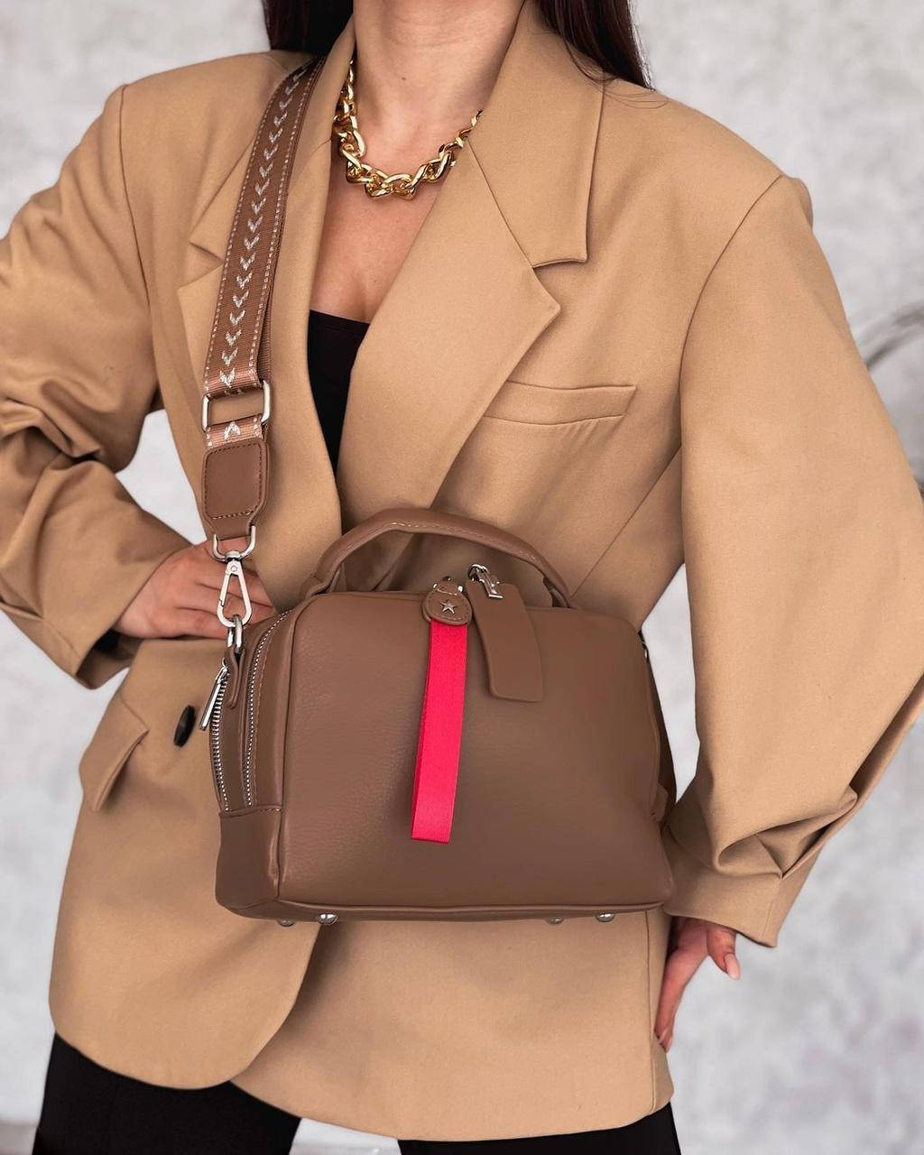 Женская сумка чемоданчик на широком ремне модная молодежная коричневая экокожа