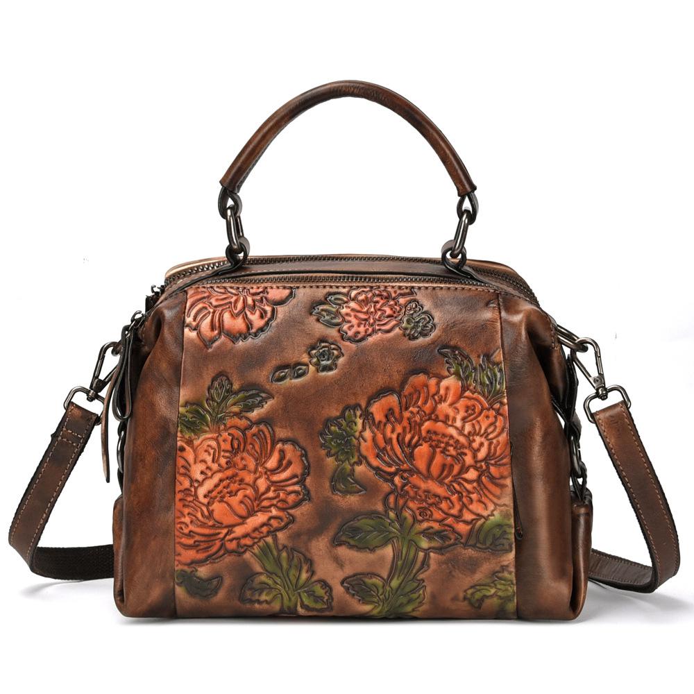 Женская сумка Johnature в стиле ретро с тиснением и цветком, сумка из натуральной кожи, большие вместительные сумки на плечо и через плечо из воловьей кожи кофейный