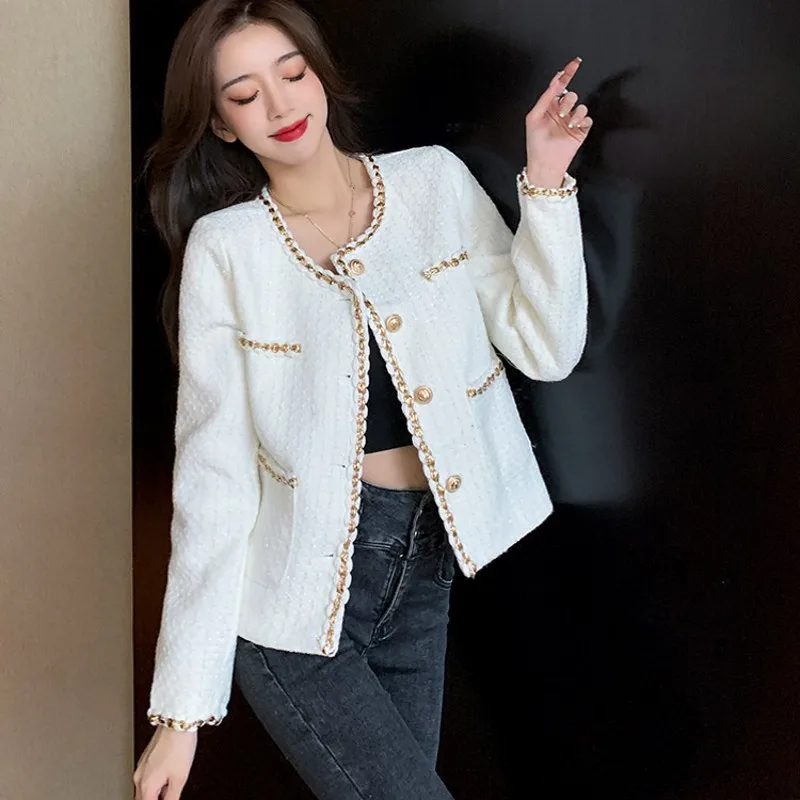 Женская твидовая куртка на пуговицах, модельное пальто с золотыми пуговицами, винтажная верхняя одежда, осень-зима