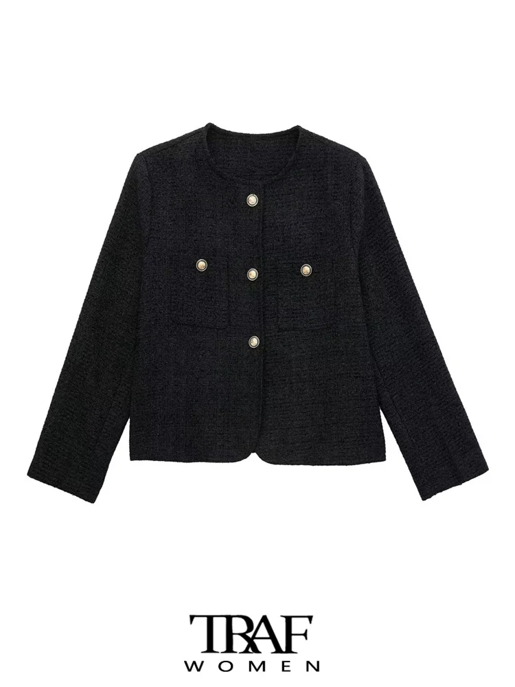 Женская твидовая куртка с длинным рукавом, круглым вырезом и металлическими пуговицами