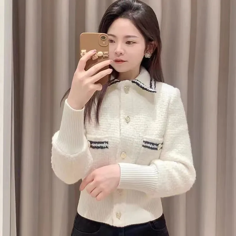 Женская твидовая трикотажная куртка, однотонный топ с воротником в рубчик и отложным воротником для осени и зимы
