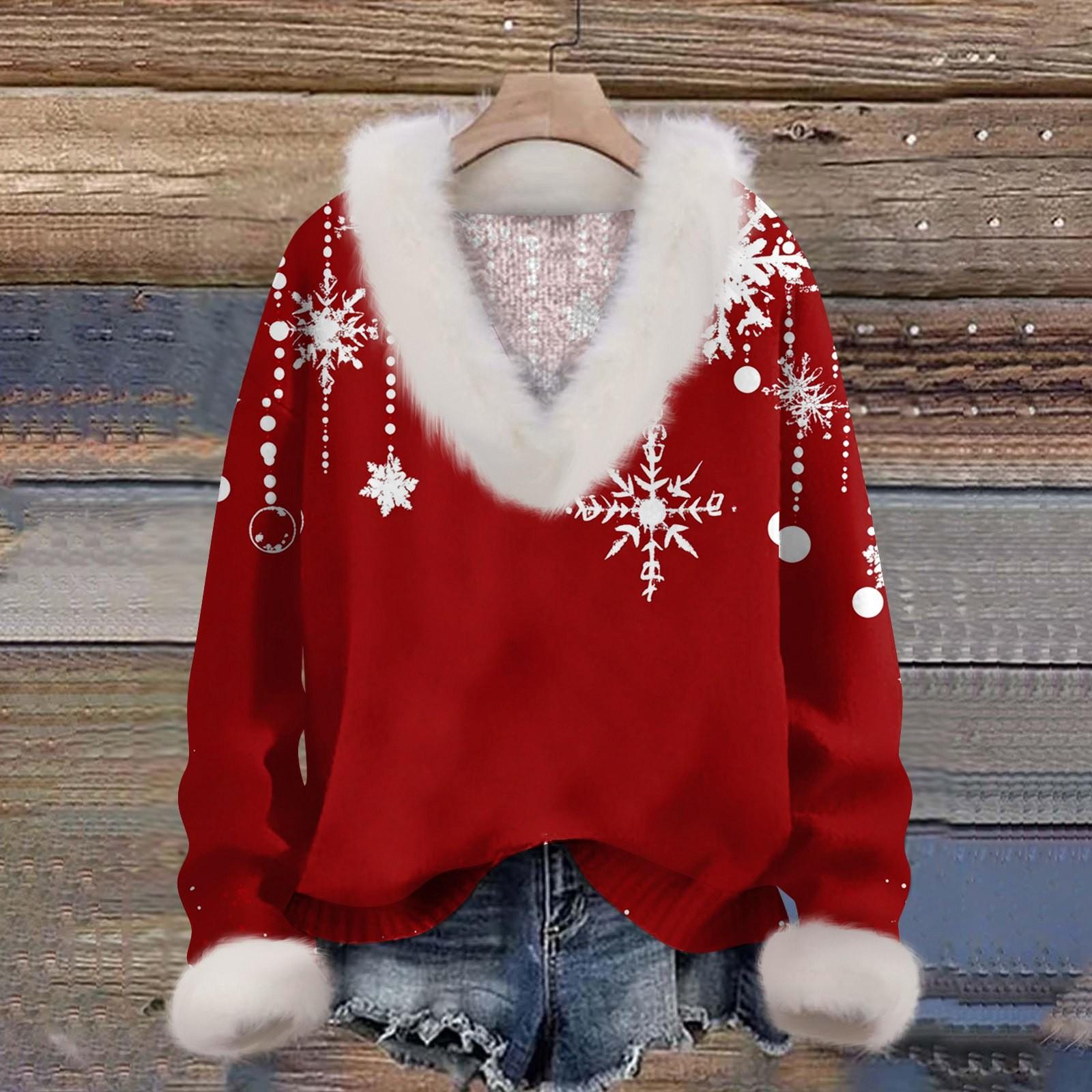Женская толстовка с длинным рукавом, рождественским принтом, плюшевым воротником, V-образным вырезом, пуловер XXXL красный