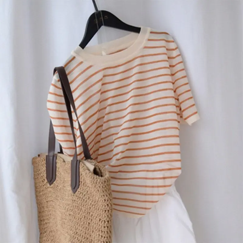 Женская тонкая футболка в полоску, оранжевая тонкая футболка с коротким рукавом, лето 2023