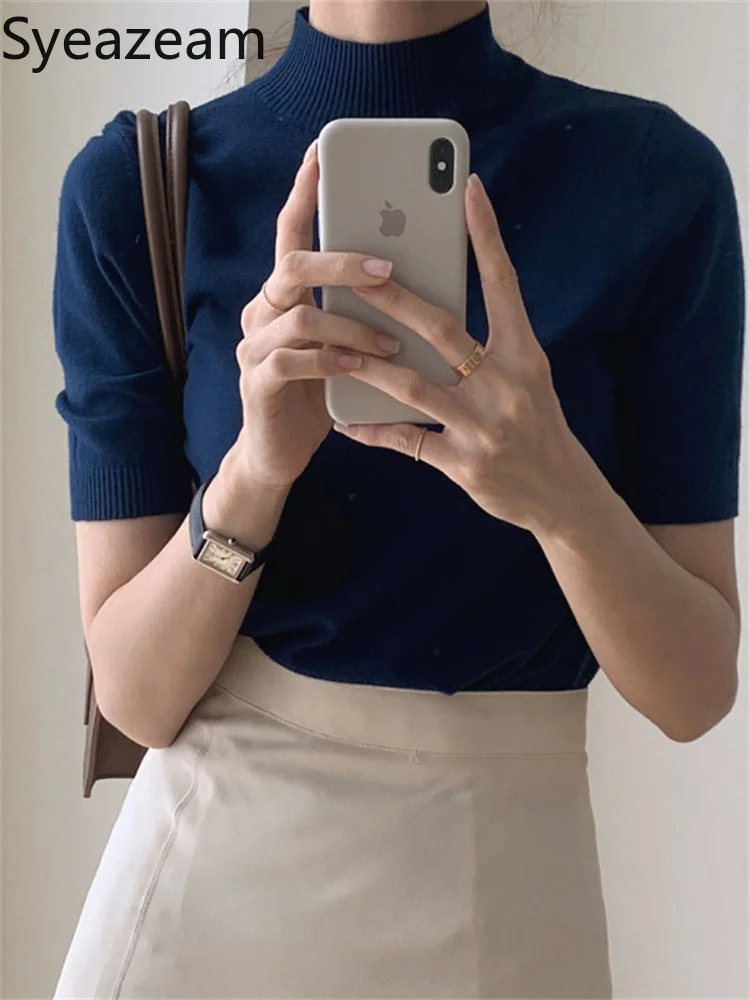 Женская трикотажная рубашка с коротким рукавом и полувысоким воротником