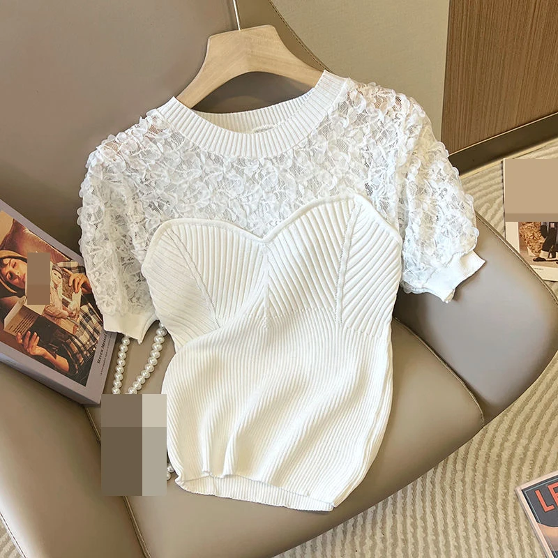 Женская трикотажная рубашка с рукавами-фонариками и круглым вырезом