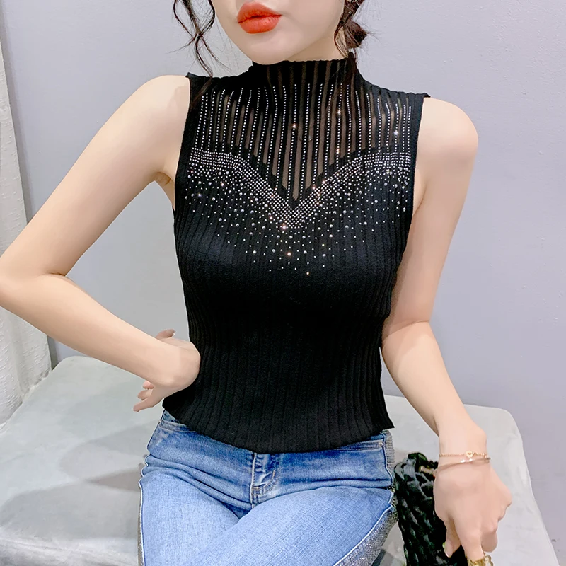 Женская трикотажная футболка без рукавов, привлекательная облегающая футболка с высоким воротником, модель 2023 в европейском стиле на лето, 34114