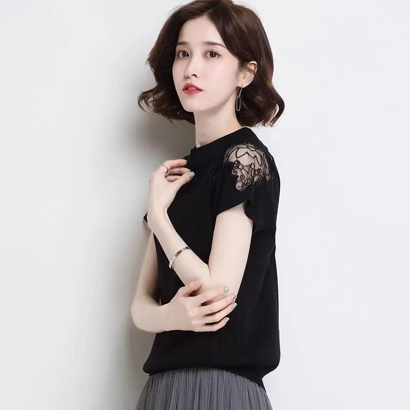 Женская трикотажная футболка с коротким рукавом, короткая кружевная модная женская одежда, футболка, вязаный свитер из ледяного шелка 3XL чёрный